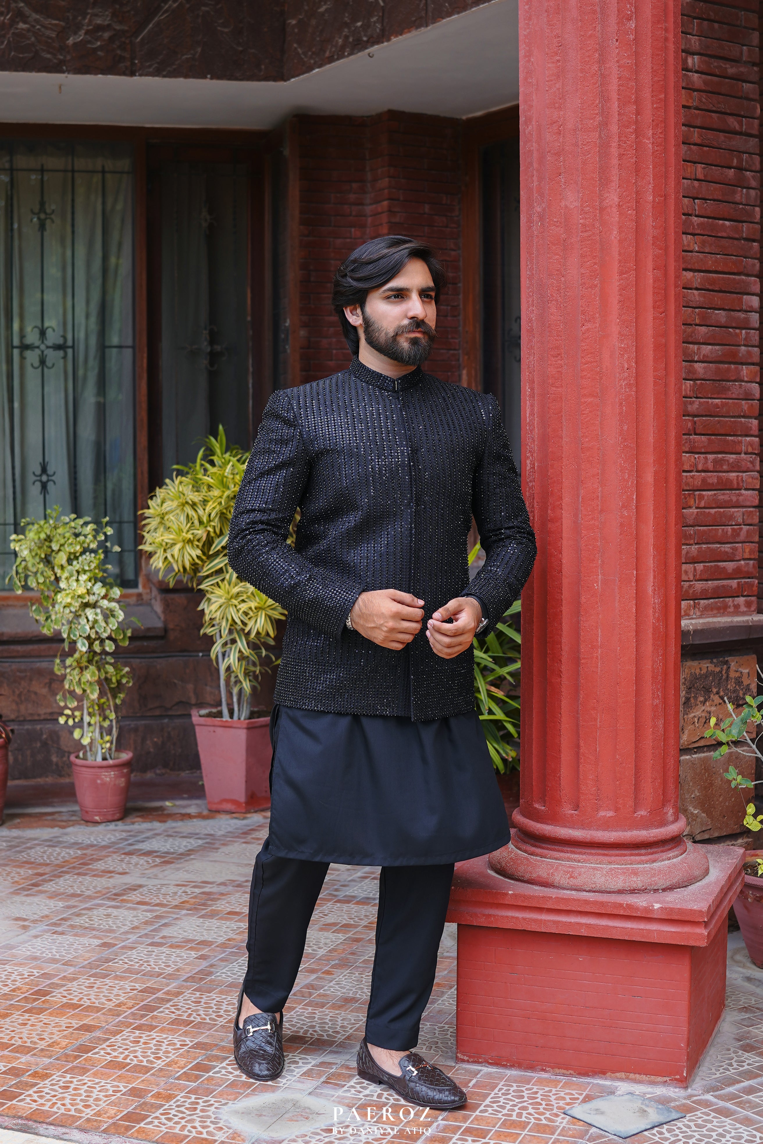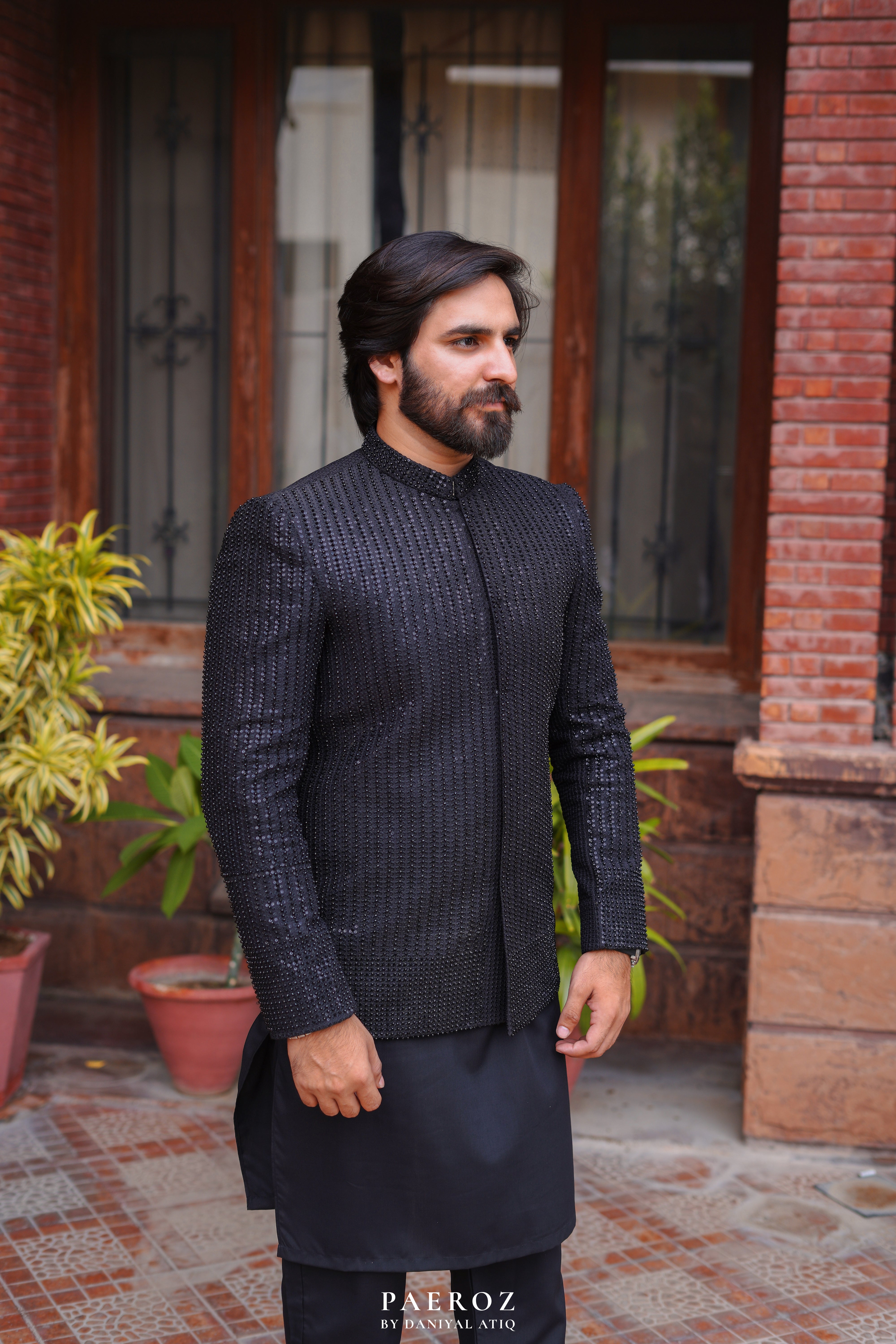 Elevate your formal attire with our Black Prince Coat, tailored to perfection in jacquard self fabric. This coat features exquisite machine embroidery (Mysuri) and embedded beads by hand, adding a touch of sophistication. The inside buttons further enhance its elegant design.