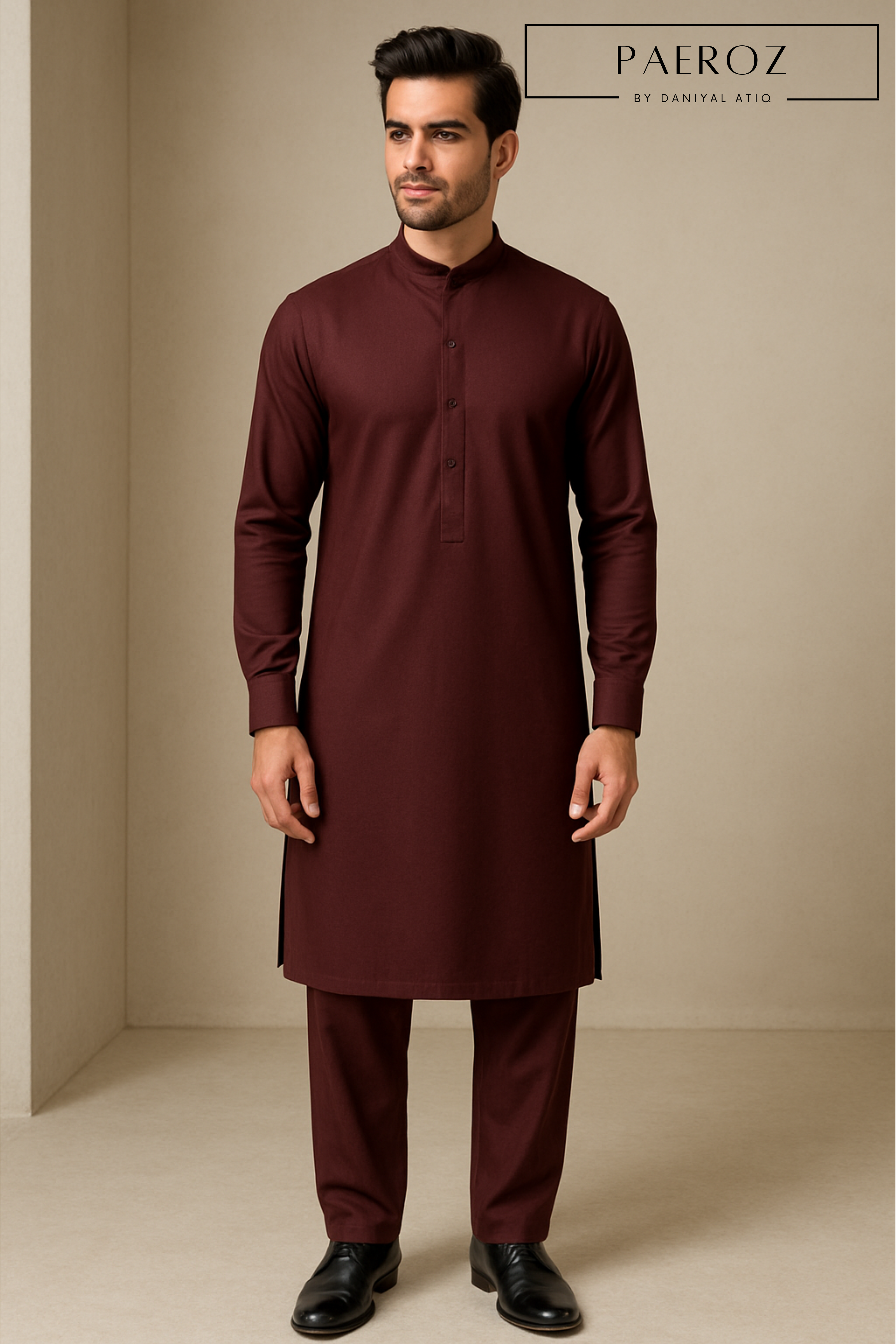 Turn heads with this Burgundy Kurta Pajama and Waistcoat Set, crafted from the same luxurious suiting fabric for all three pieces. This deep maroon shade exudes warmth, richness, and class — ideal for traditional events with a modern twist.