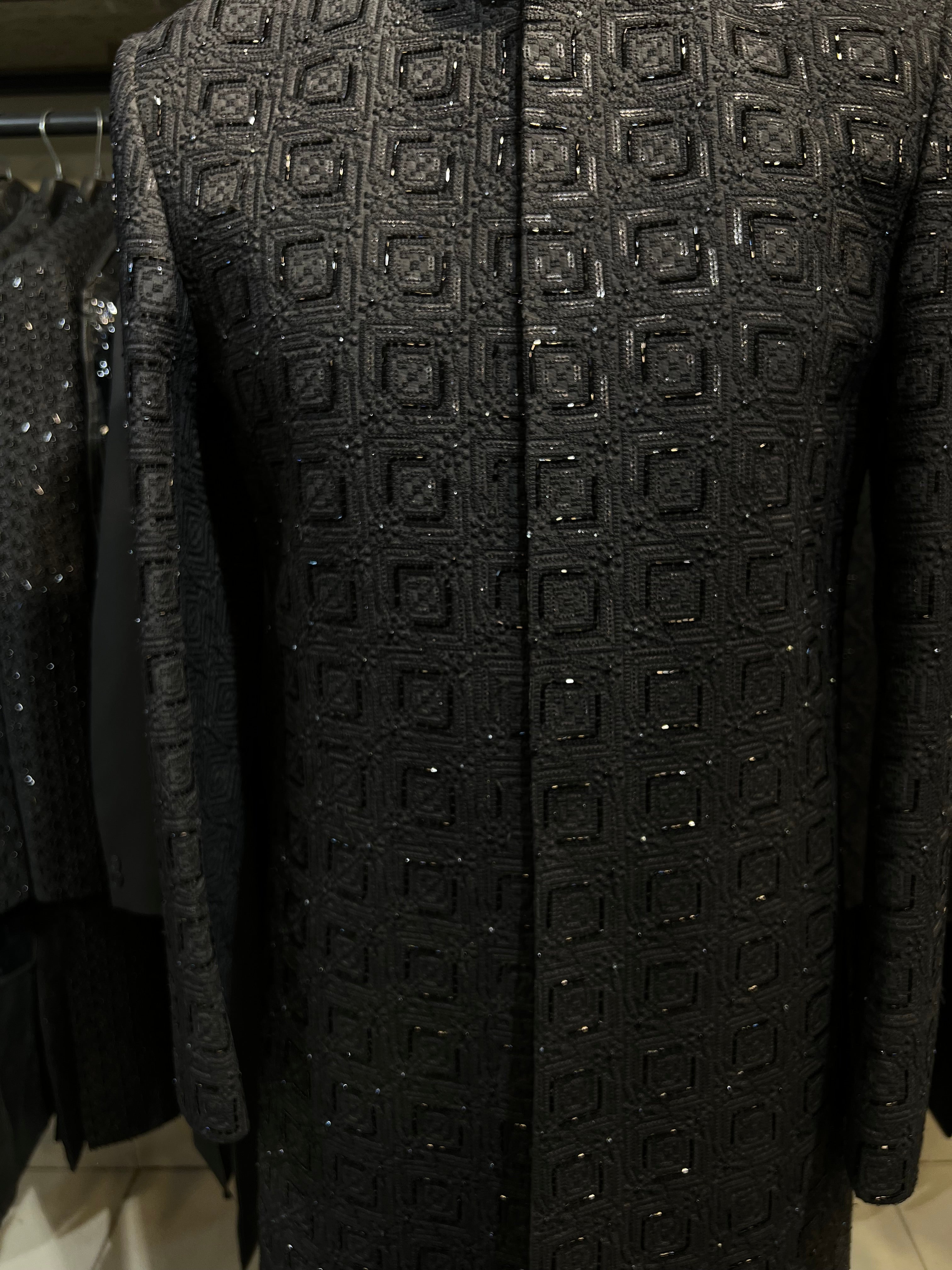 Step into tradition with a bold, modern edge. This Jet Black Sherwani is a masterpiece of craftsmanship, featuring all-over front geometry cut Danna handwork—a perfect blend of symmetry and shine. Designed for those who appreciate detail and presence, this ensemble is your statement for the big day or any grand celebration.