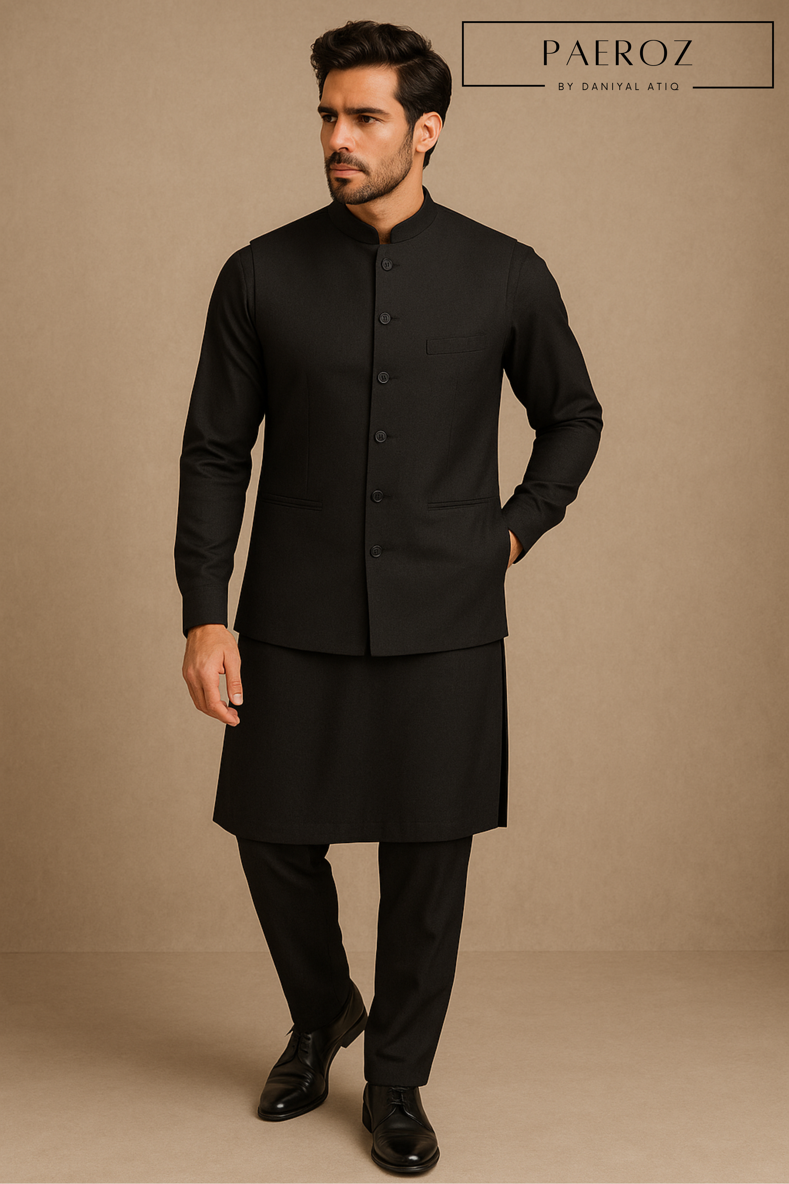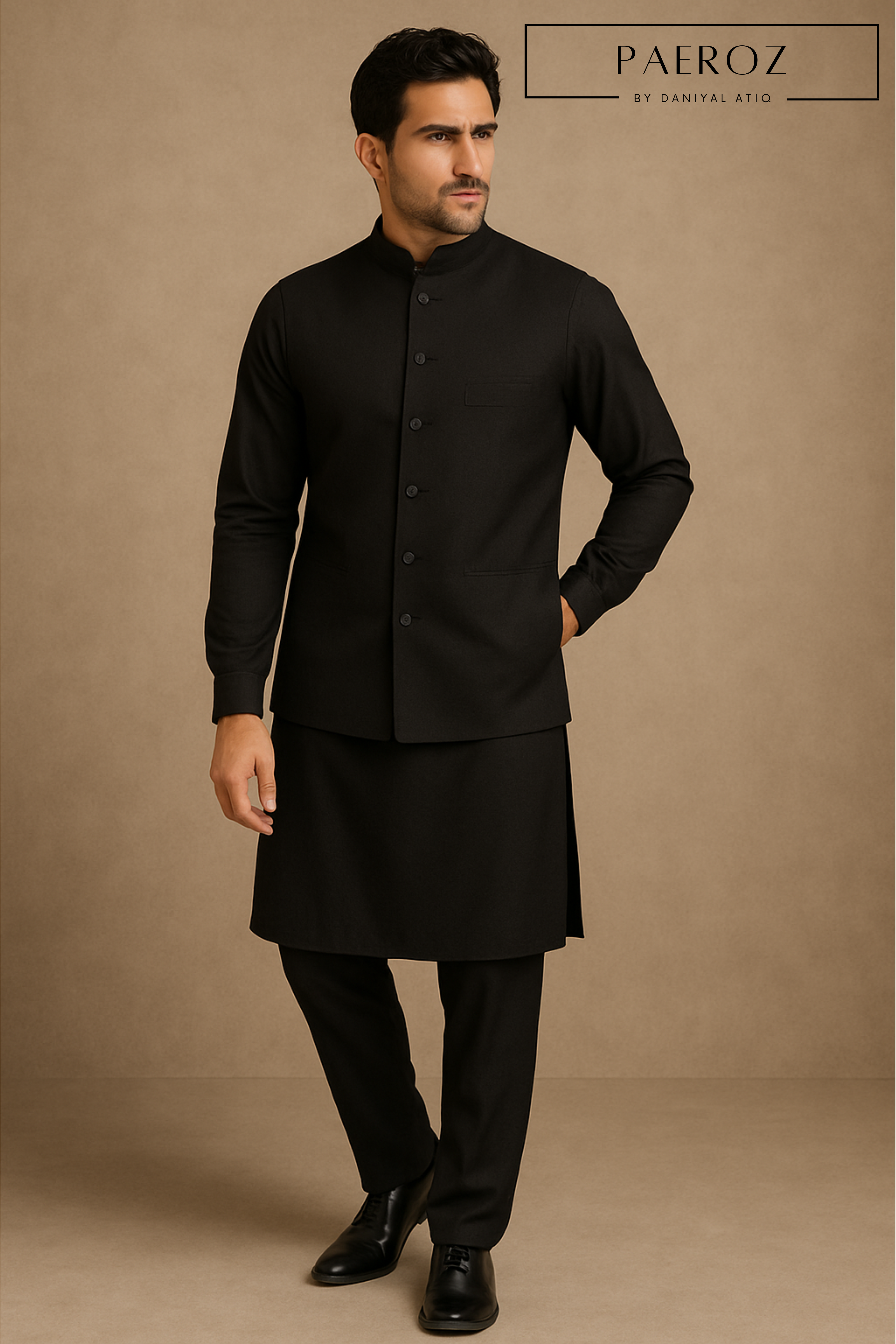 Make a powerful statement with this Jet Black 3-Piece Kurta Pajama and Waistcoat Set, designed in a matching tone and fabric for a sleek, uninterrupted look. Crafted from high-quality suiting material, this outfit combines traditional Eastern style with modern tailoring.