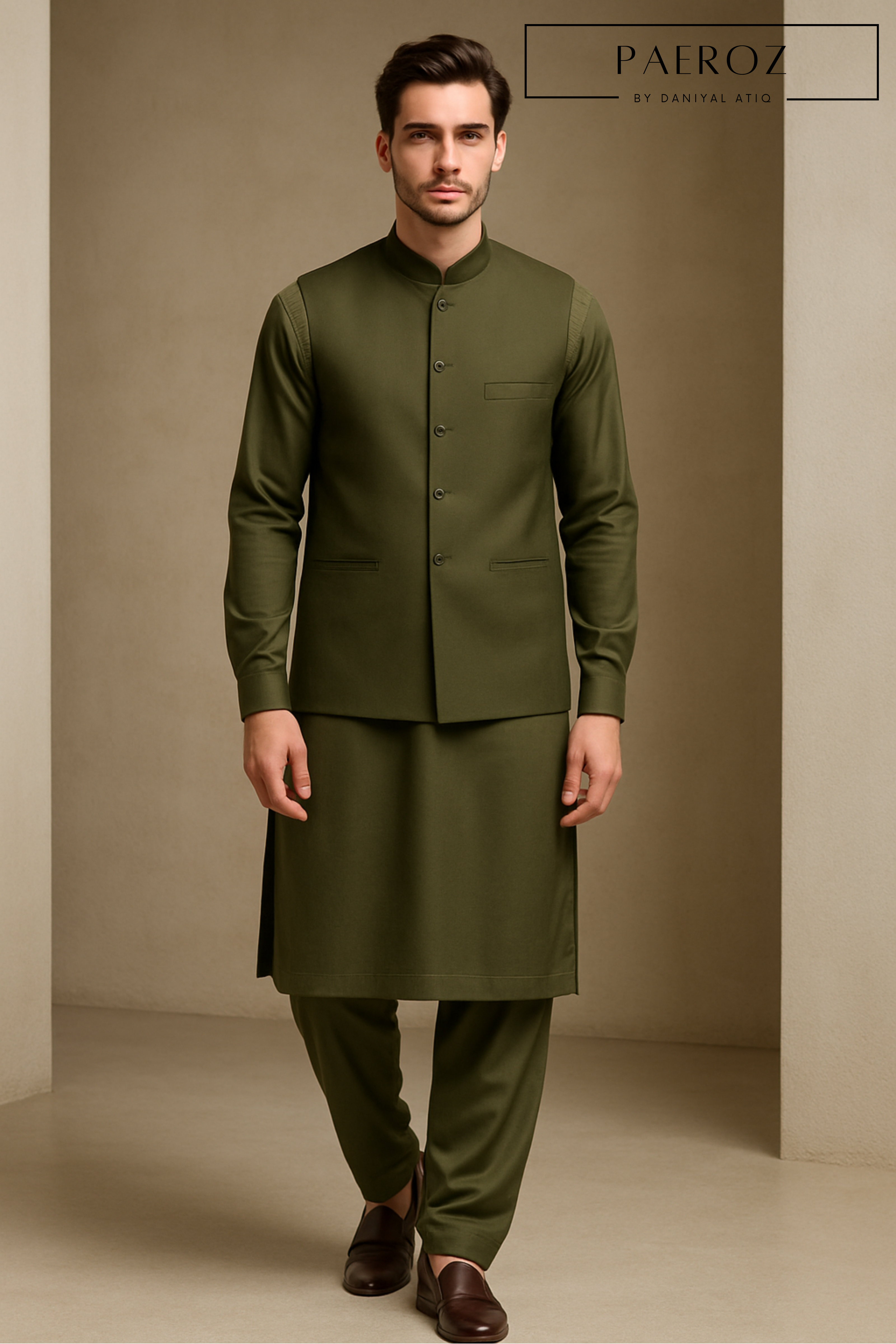 This Olive Green 3-Piece Kurta Pajama and Waistcoat Set blends tradition with trend. Made from the same premium suiting fabric across all three pieces, this outfit creates a smooth, well-matched look that’s ideal for fashion-forward men.