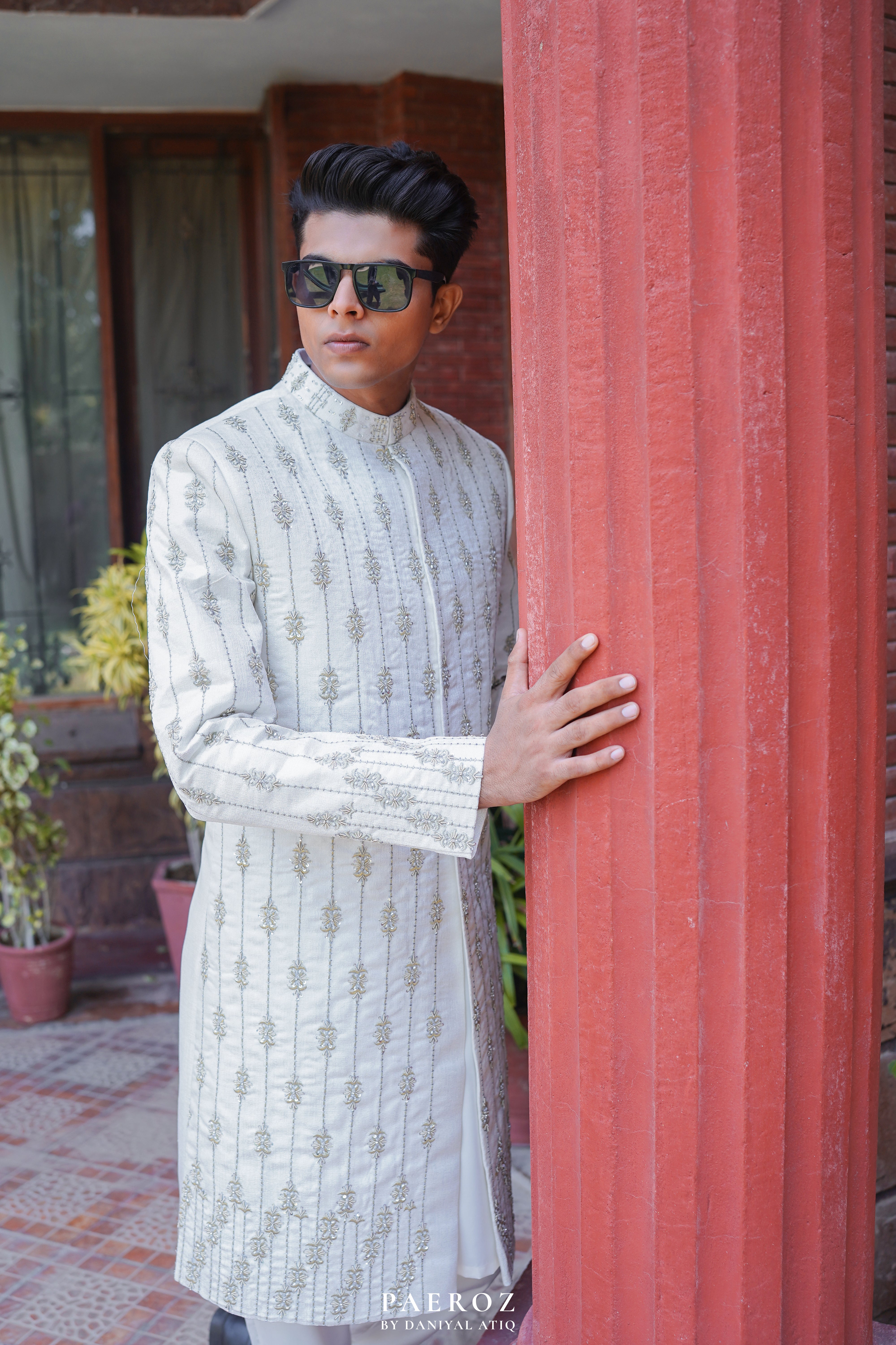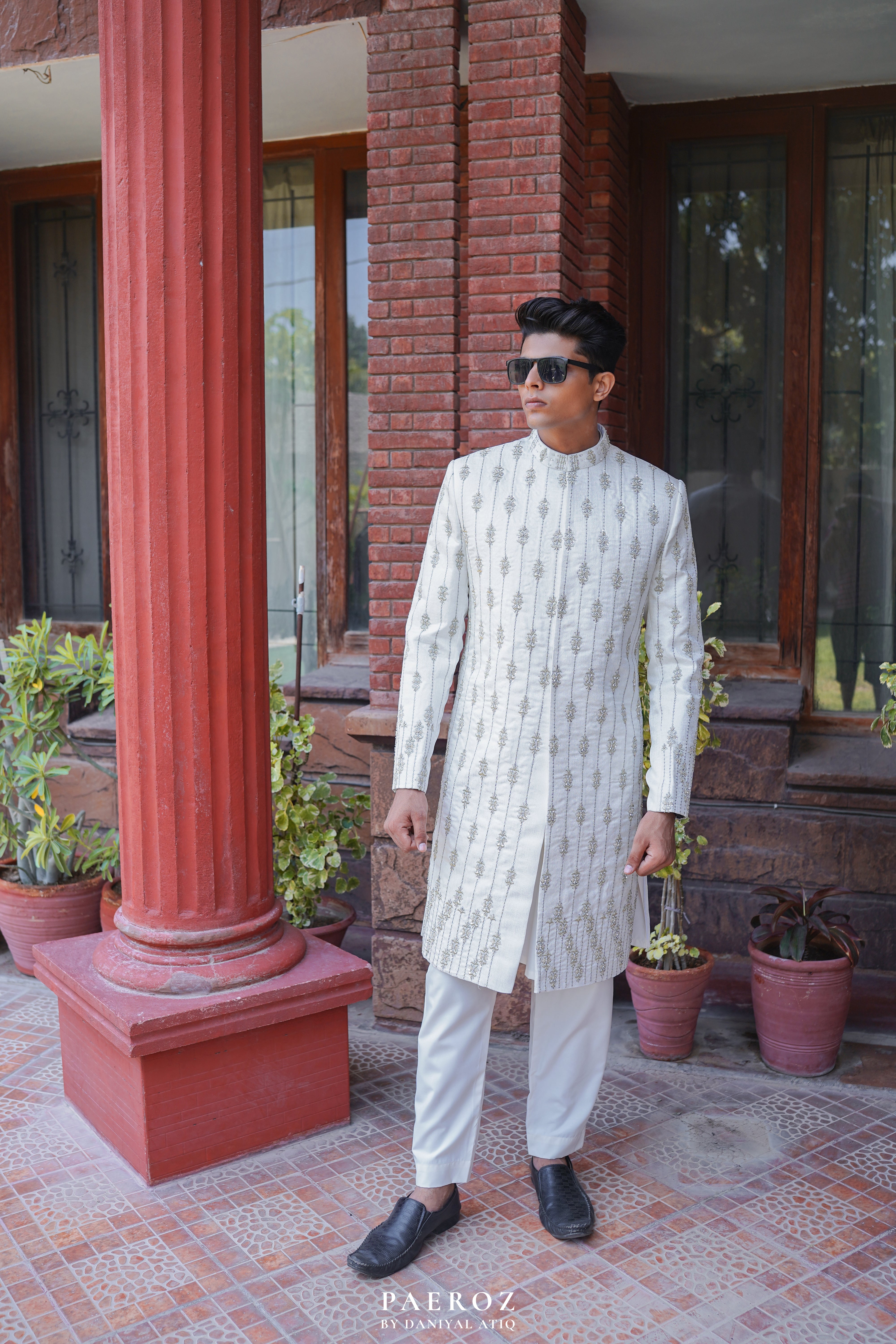 Step into tradition with our exquisite White Sherwani, meticulously crafted in self fabric adorned with intricate zari and beads handwork. This sherwani exudes timeless elegance, perfect for weddings and special occasions.